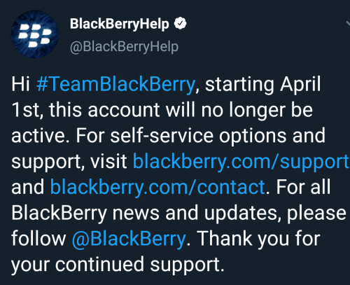 Wie BlackBerry, natürlich auf Twitter, bekannt gegeben hat, wird der Twitter-Account "BlackBerryHelp" zum 01. April 2020 eingestellt.